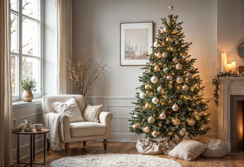 • Obývací pokoj blízko vstupu. Ne přímo v cestě, ale v zorném poli od vchodu — stromek při příchodu uvítá hosty i členy rodiny, zvyšuje pocit tepla a bezpečí.